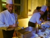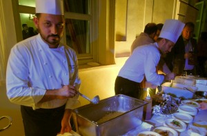 Der Abend war ein volles Erlebnis von Aromen und Düfte aus Sizilien. Der Küchenchef Vincenzo Candiano, des Restaurants La Locanda Don Serafino in Ragusa (zwei Michelin-Sterne), hat die “corallini risottati” (Risotto mit Suppennudeln) vorbereitet, verrührt wurde es mit Caciocavallo aus Ragusa und geschmortem Schweinefleisch mit Rosmarin. Valentina Chiaromonte vom Restaurant FUD OFF in Catania präsentierte Stockfisch mit Bagna Cauda-Schaum.
