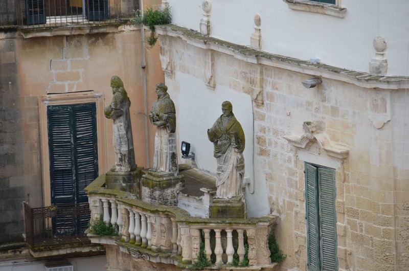 Lecce – Die barocke Welt wurde in den typischen Stein geschnitzt und ist ein fragiles Kunststück, das leicht bröckelt. EinTriumph von Girlanden, Statuen, Schnörkeln, Köpfen. Von der Terrasse des Seminario-Palasten kann man die Prachtstücke der Stadt näher bewundern.