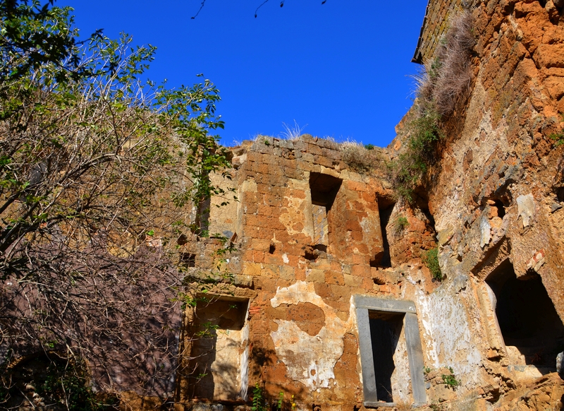 Der Steg zu Civita di Bagnoregio wurde auf soliden Zementpfeilern konstruiert. Wenn man darüber läuft. vergisst man, dass die Basis des winzigen, hoch auf dem Fels gelegenen Dorfes von der Erosion konsumiert wird. Irgendwann ist der Einsturz von Civita schon vorgesehen. Der letzte Teil des Steges ist so steil, dass das Eingangstor wie ein sportliches Wettkampfziel erscheint. Wir blicken zurück: Eine raue Natur erstreckt sich kilometerweit im Dunkel. Wälder und erodierte Berge verschmelzen zu einem einzigartigen Panorama.