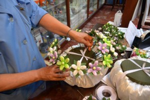 Eine der bekanntesten Produzenten-Familien von Zuckermandeln in Sulmona ist die von Mario Pelino. Von außen sieht die kleine Süßigkeiten-Fabrik wie ein weißes, niedliches Haus aus, das in ein Märchen gut passen würde. Und tatsächlich hat das Unternehmen Pelino etwas Fabelhaftes. In erster Linie hüten die Familienmitglieder ein Geheimnis, das es ihnen ermöglicht, ohne Zusatzstoffe ihre exquisiten Zuckermandeln herzustellen. Aber da man über Geheimnisse nicht gerne spricht, erzählt Mario Pelino lieber die spannende Geschichte seiner Familie: sieben Generationen einer Familie, die das Unternehmen mit viel Leidenschaft und Kreativität betreibt und eine Produktion, die auf Qualität setzt. Die Mandeln kommen aus Sizilien, „es ist aber kein Zufall, dass gerade in Sulmona die Zuckermandeln eine lange Tradition haben. Hier gab es in der Vergangenheit viele Mandelbäume, die es leider nicht mehr gibt“, sagt Pelino. „Unsere Familie hatte den Vorteil, die Fabrik in unmittelbarer Nähe des Bahnhofs zu haben. Ich kann mich noch gut erinnern, als die großen Kisten voll frischer Mandeln aus den Zügen ausgeladen wurden“. Zuckersüß und gemütlich ist der Laden der Firma, der sich im selben Bau der Fabrik befindet. Hier kann man Schachteln, Blumen, Säckchen voll bunter Zuckermandeln kaufen und der Handwerkerin auf die Finger schauen, während sie eine stilvolle Blume flicht. Die Firma Pelino hat auch ein kleines Museum der Zuckermandeln kreiert, das man frei besichtigen kann. Mario erklärt, dass die Tradition der Zuckermandeln-Blumen vielleicht von den Klarissinnen kommen könnte, die Rosenkränze mit Zuckerbällchen formten. Im Museum kann man einen davon bewundern.